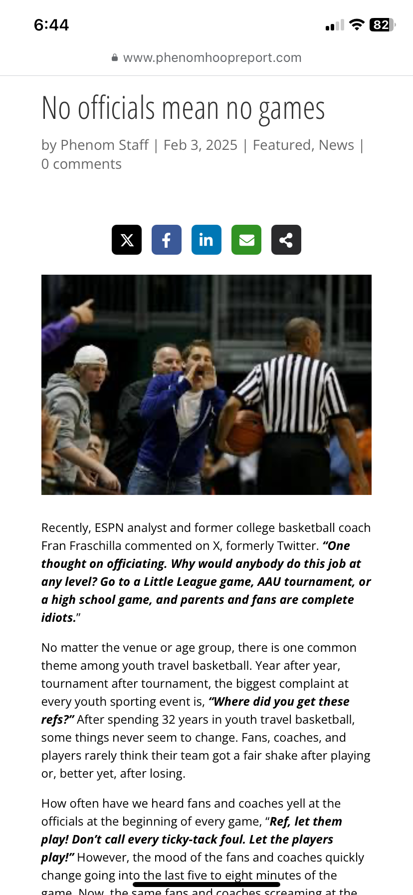 I have several of my friends who are darn good officials that are ready to give it all up. The negativity and the blame that we all receive is ridiculous. It’s 90% the officials fault for the lack of ability, lack of being able to dribble, lack of scoring, lack of playing defense, lack of blocking o...