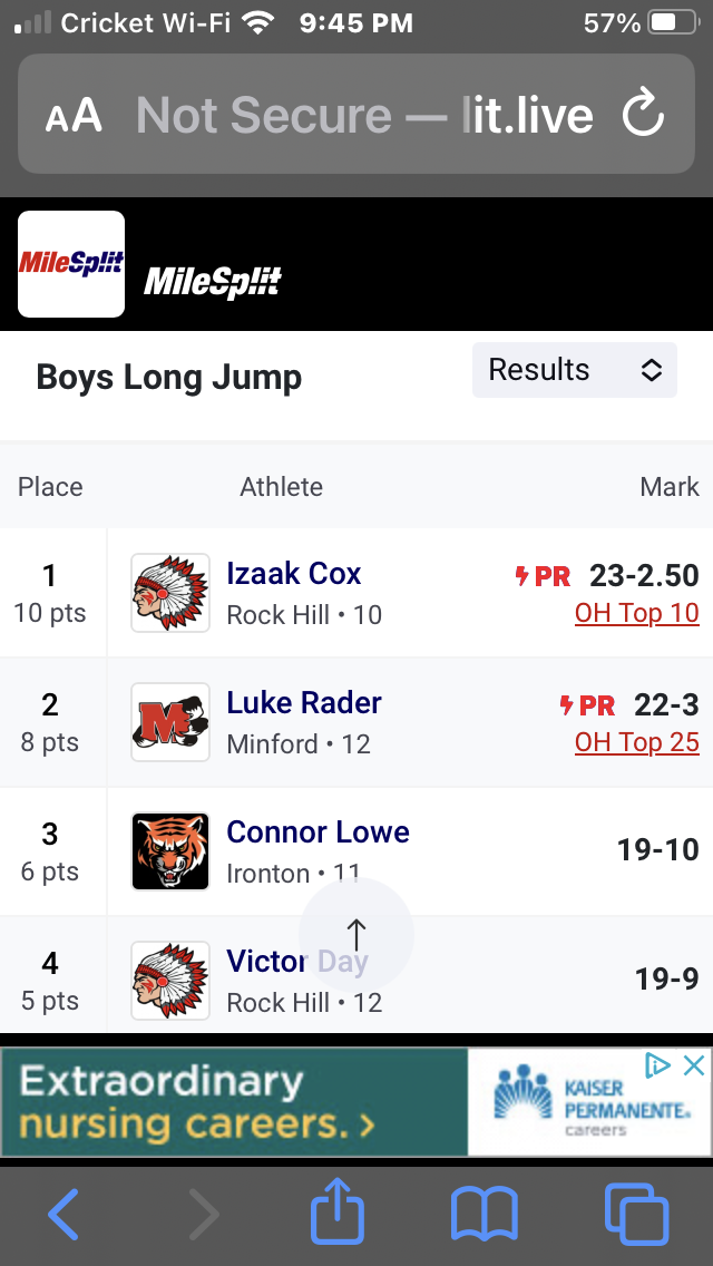 RHRedmenLive wrote: Thu May 04, 2023 9:46 pm Rock Hill’s Izaak Cox and Minford’s Luke Rader Both put on a show tonight at Rock Hill’s invitational!! Cox broke his own record tonight going 23’ even in his first jump and then broke that in his second jump going 23’2.50”!! Luke Rader went over 22 feet twice and finished with a best of 22’3”!! 56EBF62F-643E-4E51-928E-448F399BDE89.png