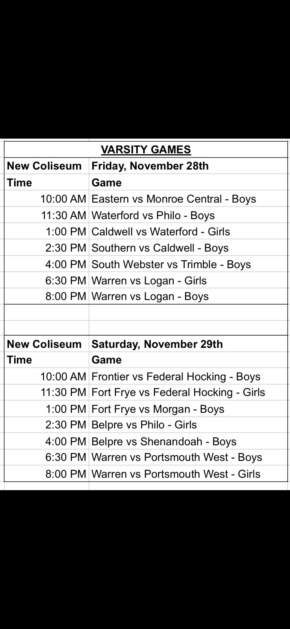 A really good lineup of games Coach ! Eastern Brown vs Monroe Central to tip things off?!! nice !!! EB will be excellent next year - with Chase Pinkerton coming back to play in his old stomping grounds at the Coliseum Barber/Pinkerton/Vance to go with an outstanding JV team - Florence/Ramer come to mind ... Waterford is a young team this past year will be improved for next year for sure ... it will be good to see a what should be a really really good South Webster squad even without Eli Roberts, Shupert & White they do return Hunter Barnard/ Brycin McClintic/Beau Stephens/ Brayden Barnard to name a few ...Trimble has struggled this season for sure but should have a good nucleus from this season coming back ...Warren taking on Logan ... the Chieftains deciding that it's ok to play Warren again now that they will lose 9 seniors to graduation ... always good to have an old SEOAL matchup ... Federal Hocking will have a good group returning from a youngster laden group this season ... Fort Frye has struggled, but I'm thinking struggling for 2 years in a row isn't part of the FF DNA ... Portsmouth West will be an excellent game for Warren ... the Westsiders will be excellent with a great group of returning starters ... I'm putting the Clash on my 2025-26 hoops Pfloyd Tour Calendar !