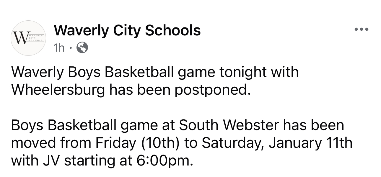 WaverlyMom wrote: Tue Jan 07, 2025 12:57 pm Waverly @ Wheelersburg tonight, 1/7, postponed. No makeup date announced.
