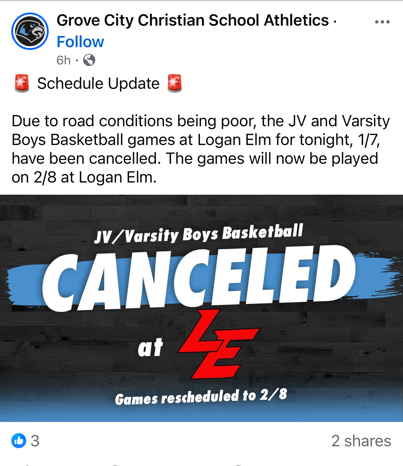 Lynchburg @ Greenfield moved from 1/7 to 1/11